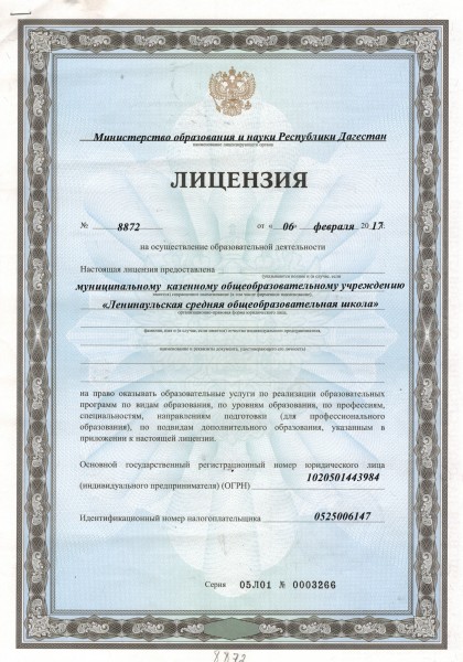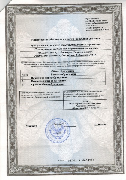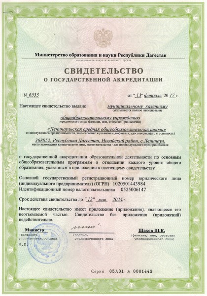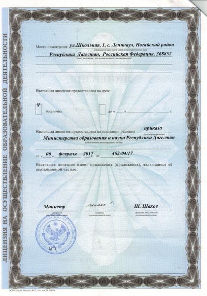 Образовательная деятельность муниципального казённого общеобразовательного учреждения "Ленинаульская средняя общеобразовательная школа" осуществляется по следующему адресу: 368852 РД Ногайский район село Ленинаул улица Кумукова №1